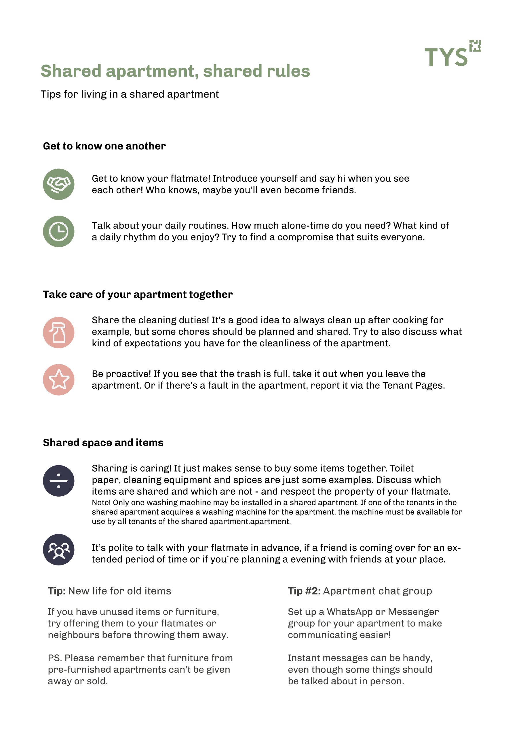 Comfortable living in a shared apartment starts with mutual agreements. TYS has compiled sample rules of what kinds of things should be agreed on in shared apartments, and what everyone should do to make shared living as smooth as possible. We recommend that you explore the rules together with your own roommates and discuss your living expectations.